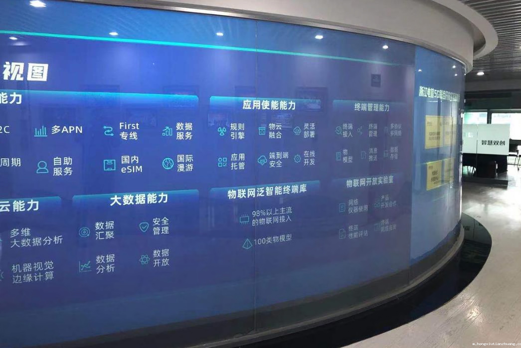 简要描述:杭州电信双创展厅的大屏显示器,可以将丰富的电信业务全面展示出来,方便了客户们的业务办理。...